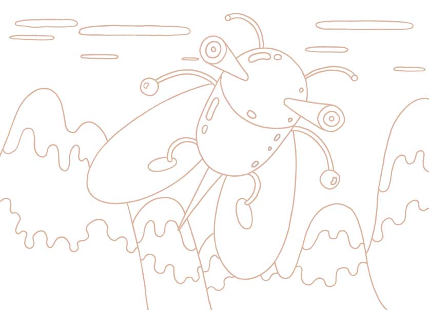 虫をモチーフにしたロボット・キャラクターのシリーズ。7七回目はムシ・ロボットが雑草の葉っぱを滑り台にして遊んでいるシーン!。